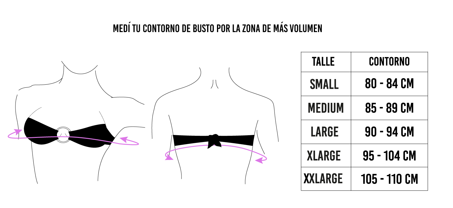 bikini en forma de bandeau, de lycra premium estampada con avío de zamac inoxidable en el centro que no calienta con la exposición solar. Resistente al cloro y mar. Contiene abertura para agregar tazas (no vienen incluidas). Regula en su espalda. Composición: 80% polyester y 20% elastano.