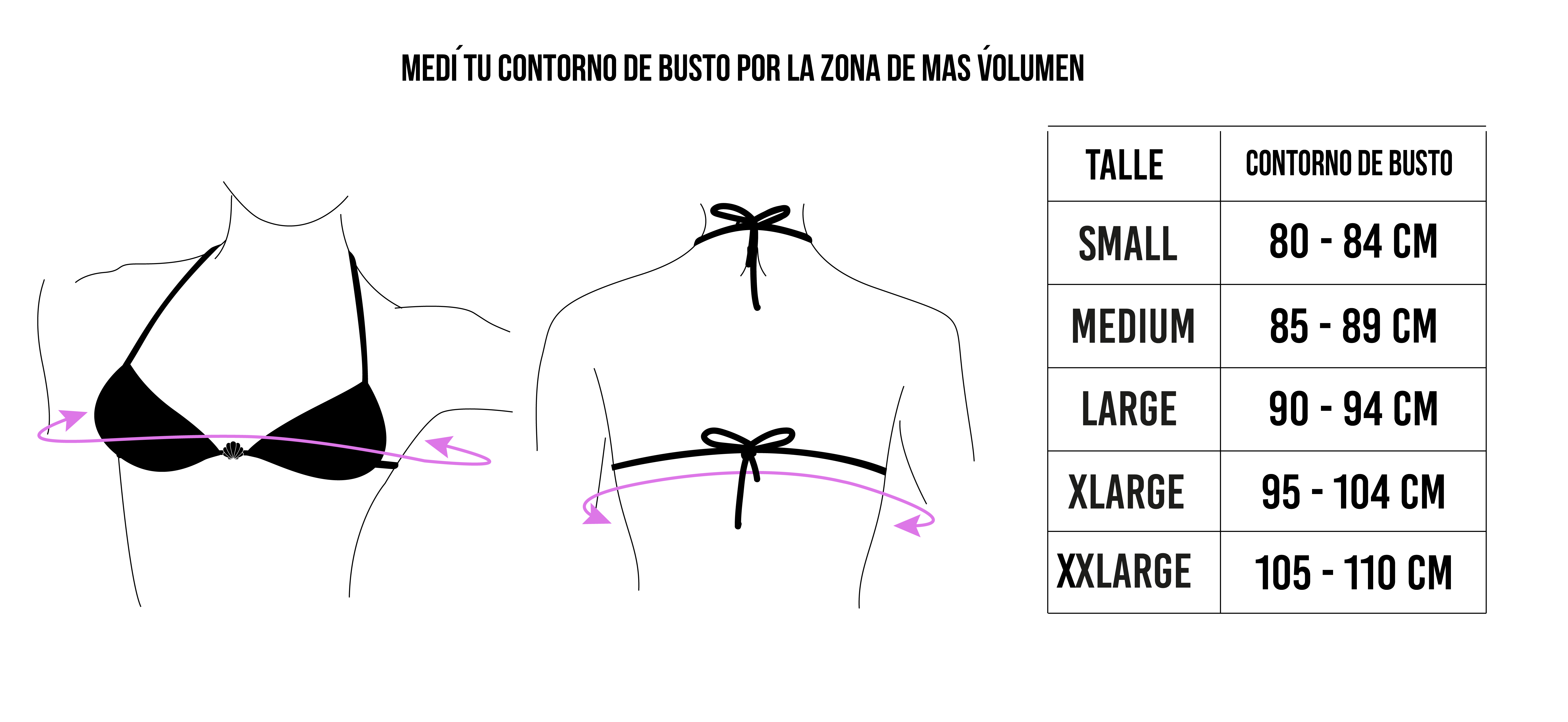 Corpiño de bikini en forma de triangulo, de lycra premium, con tiras a tono y avións de zamac de ostras. Se regula anudando en el cuello y espalda. Resistente al cloro y mar. Contiene abertura para agregar tazas desmotables (no vienen incluidas).